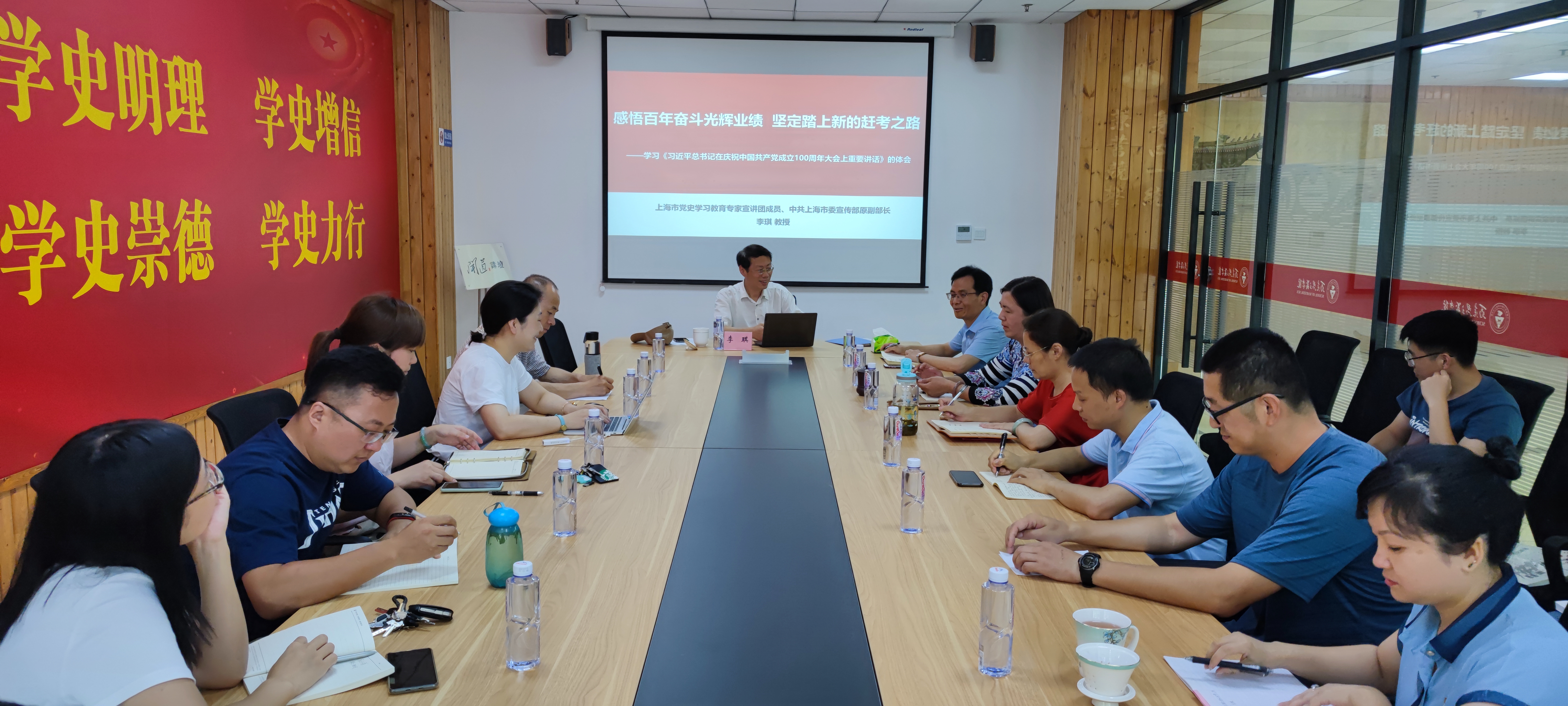7月12日下午,yl6809永利举行理论中心组(扩大)专题学习会,专题学习习近平总书记“七一”重要讲话精神。这次学习也是思政课教师集体备课会。会议邀请上海市委党史学习教育专家宣讲团成员、市委宣传部原副部长、上海市社联副主席、公司特聘研究员李琪教授作题为《感悟百年奋斗光辉业绩 坚定踏上新的赶考之路》的专题辅导报告。会前,公司党委书记、yl6809永利经理李崟与李琪教授一起参观了马克思书房,并就相关问题进行了交流。
