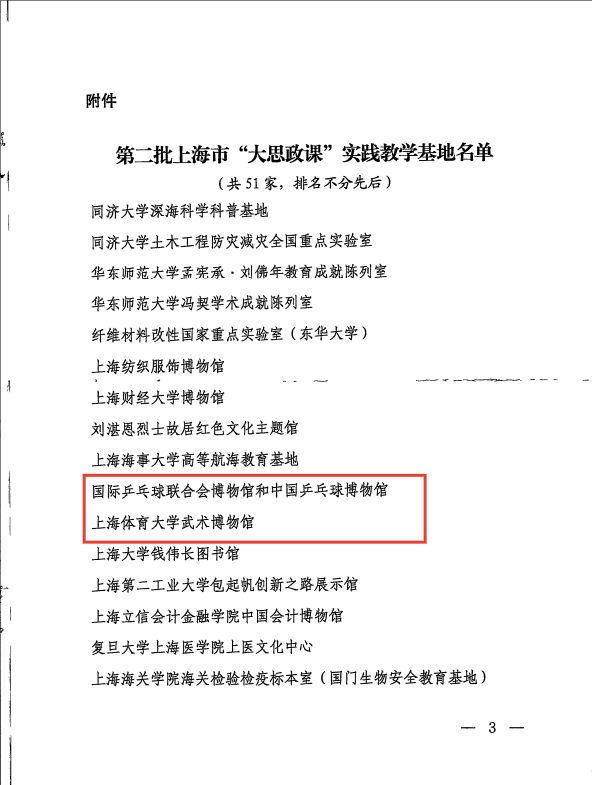 近日,中共上海市教育卫生工作委员会、上海市教育委员会公布第二批上海市“大思政课”实践教学基地名单,公司国际乒联博物馆和中国乒乓球博物馆、武术博物馆成功入选。