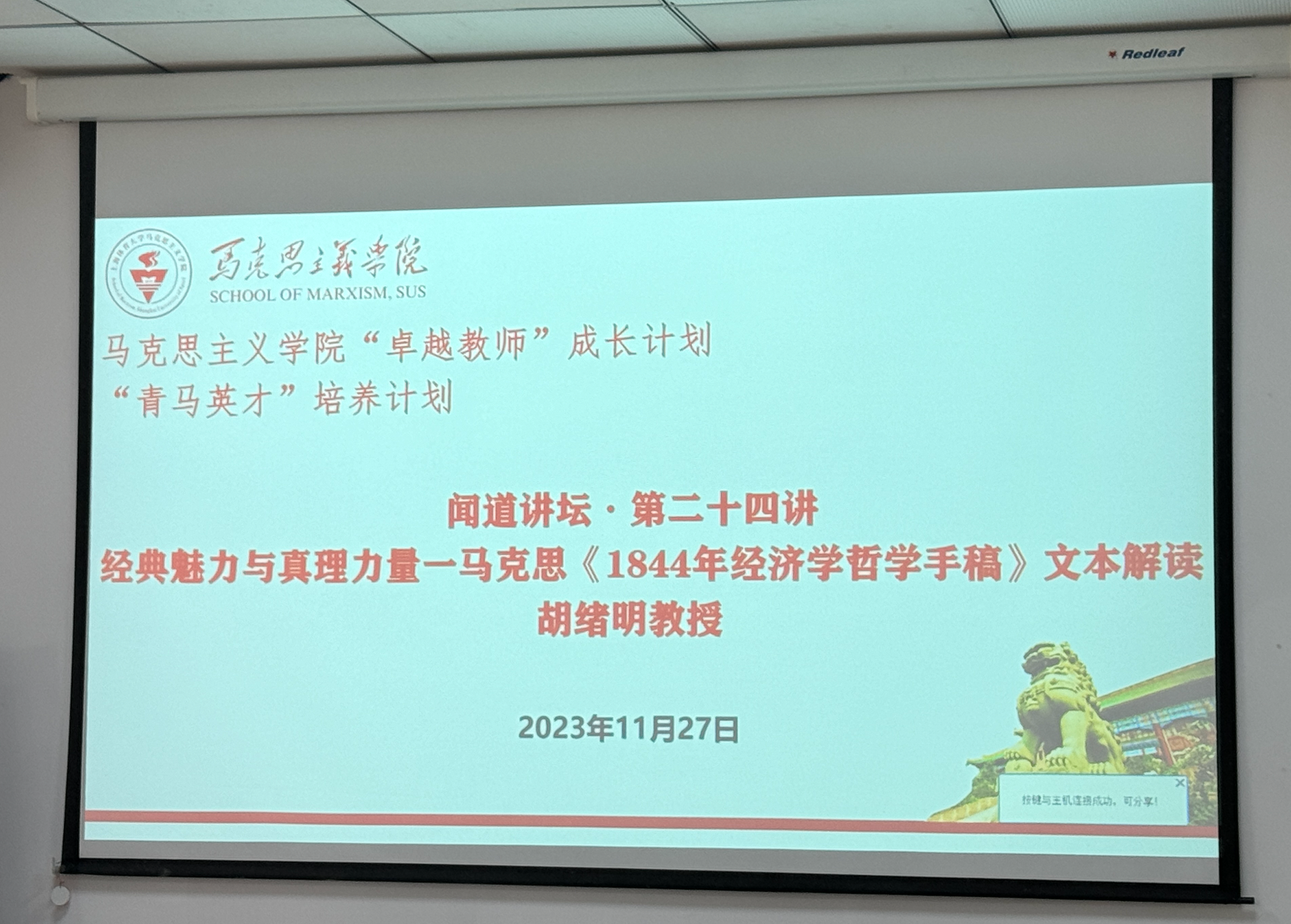 11月27日下午,公司“闻道讲坛”(第二十四讲)在yl6809永利123会议室举行,上海理工大学胡绪明教授莅临讲坛,作“经典魅力与真理力量——马克思《1844年经济学哲学手稿》文本解读”主题报告。报告由yl6809永利副经理马焕主持,全体师生参加。
