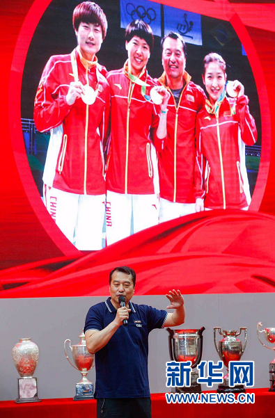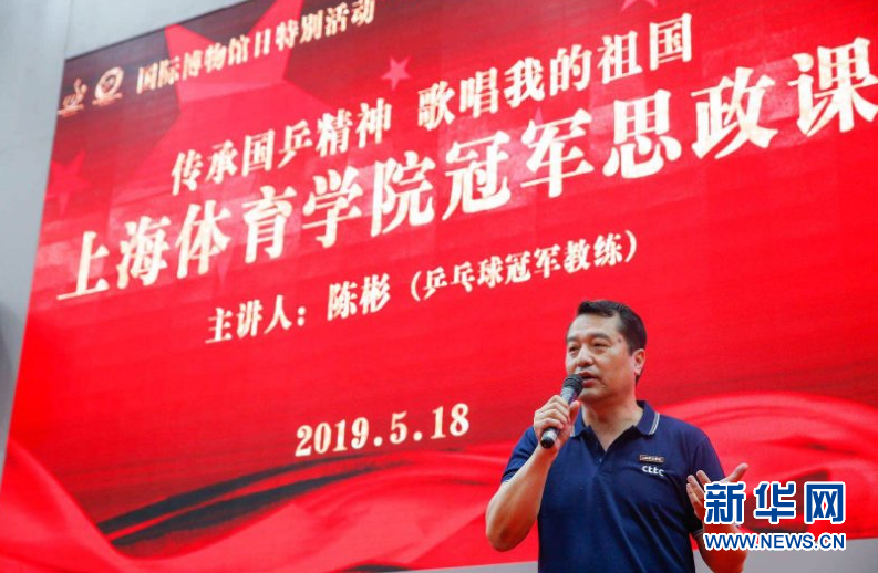 中国乒乓球队的冠军教练、中国乒乓球公司的教师陈彬(原丁宁主管教练)讲述“国乒精神”。上海体育公司供图