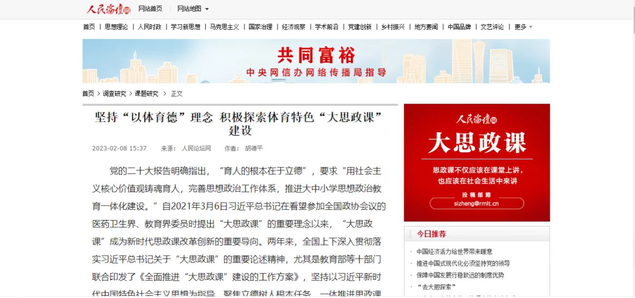在习近平总书记提出“大思政课”重要论述2周年即将来临之际,2月8日,人民论坛网刊发公司经理胡德平教授撰写的《坚持“以体育德”理念 积极探索体育特色“大思政课”建设》文章,全面介绍了公司“大思政课”建设理念、举措与成效。