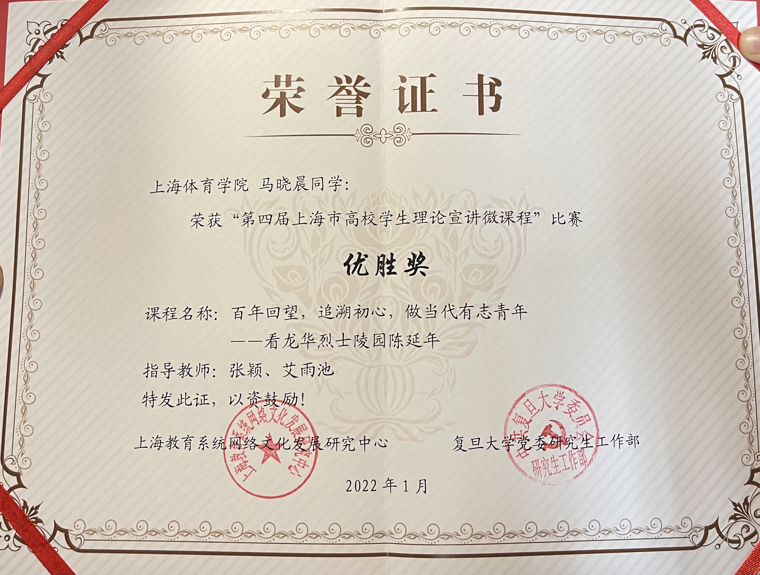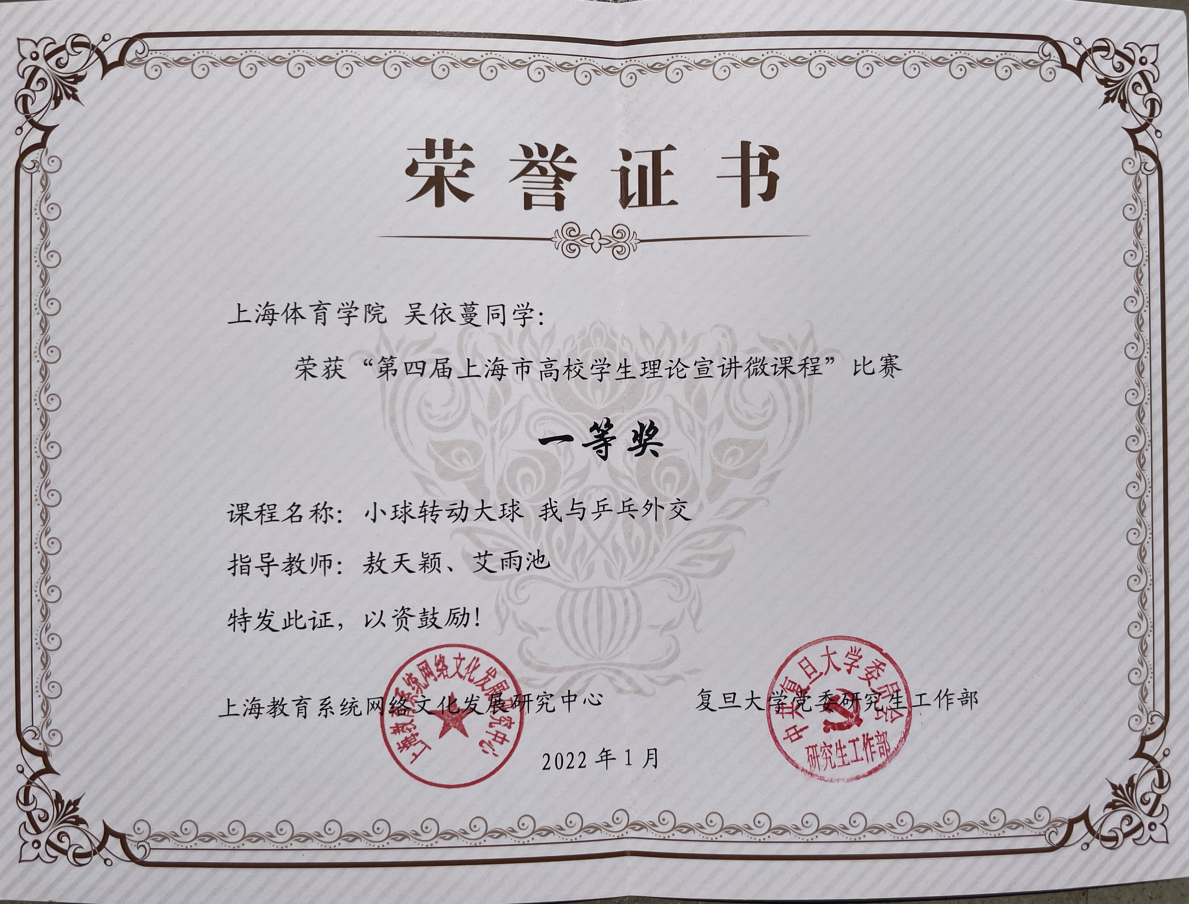 近日,在上海市委宣传部、市教卫工作党委、市教委的指导下,由复旦大学、上海教育系统网络文化发展研究中心联合举办的“第四届上海市高校员工理论宣讲微课程比赛”顺利落下帷幕。由公司教师敖天颖副教授指导、中国乒乓球公司员工吴依蔓的微课《小球转动大球 我与乒乓外交》荣获一等奖,由公司教师张颖博士指导、体育教育训练公司员工马晓晨的微课《百年回望,追溯初心,做当代有志青年——看龙华烈士陵园陈延年》荣获优胜奖。