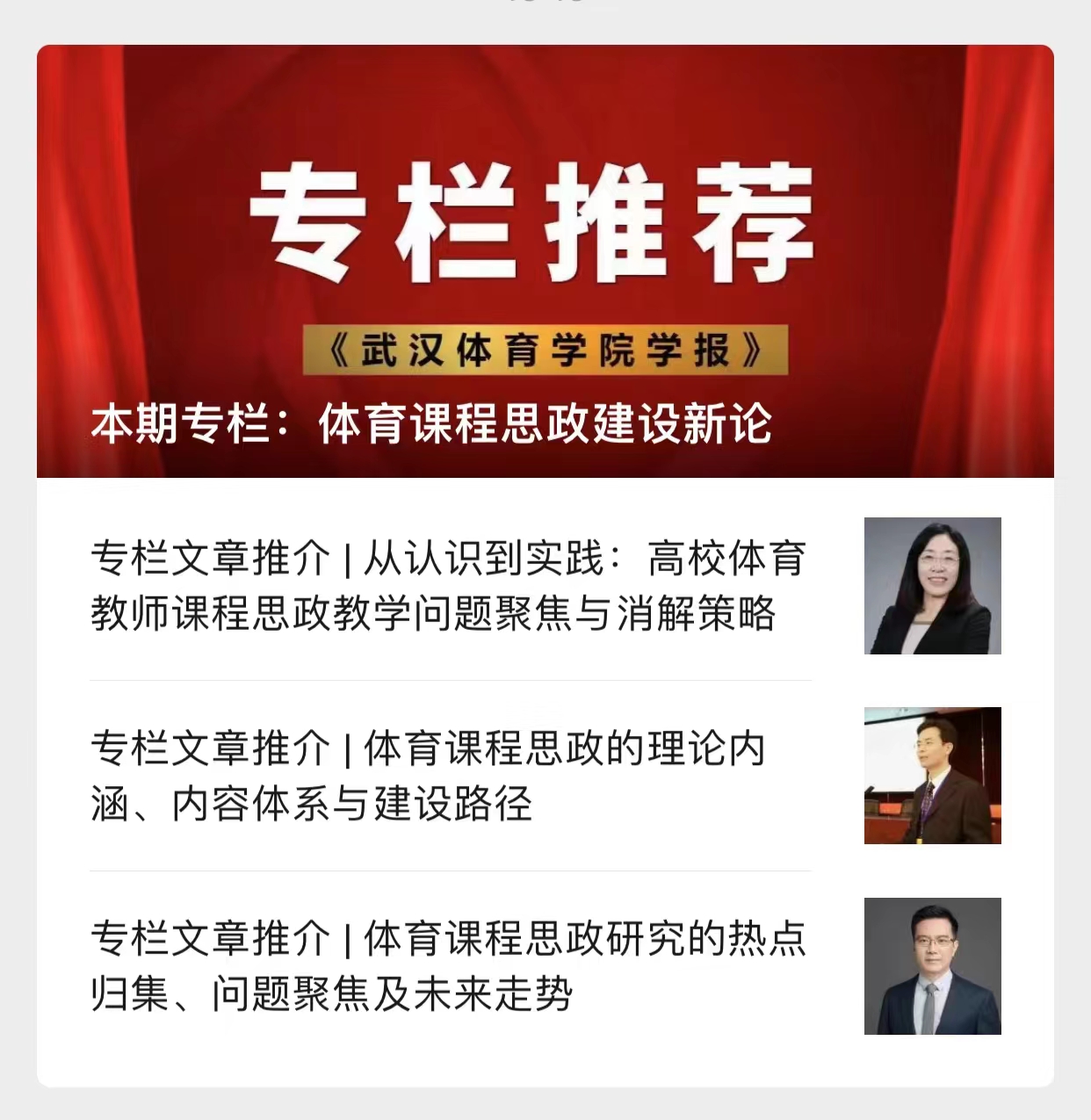 近日,公司经理胡德平教授撰写的学术论文《体育课程思政的理论内涵、内容体系与建设路径》在《武汉体育公司学报》(CSSCI)2022年第5期发表,并作为专栏文章被重点推介。