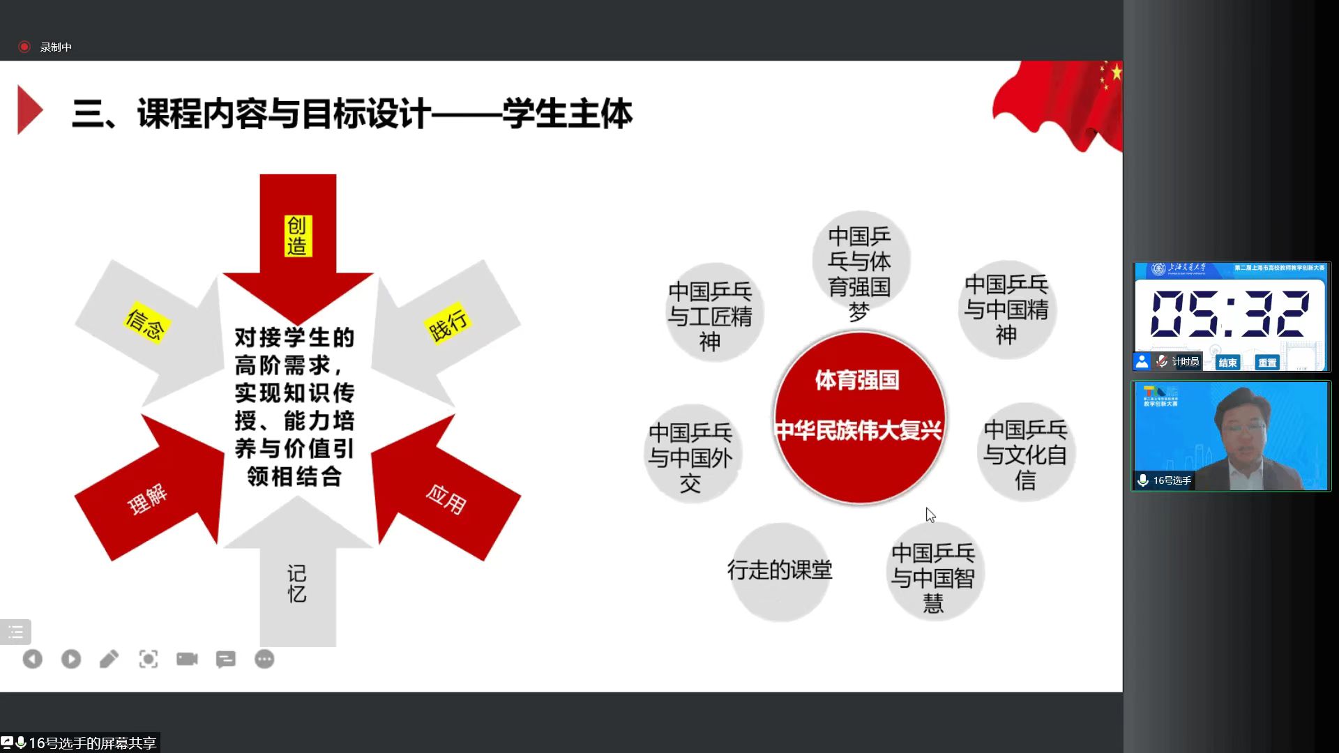 于永超以《国乒荣耀》课程参赛,在资料评审、线上汇报等环节中充分展示了“以体育德”、“馆课融合”等富有特色的教学创新理念与实践。《国乒荣耀》课是在公司党委领导下,由党委书记李崟领衔开发的特色思政类通识教育选修课,课程自开设以来,始终坚持创新与特色建设,取得了良好的公司产品效果,先后入选国家级一流本科课程(社会实践类)、教育部课程思政示范课程。