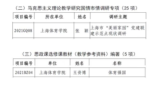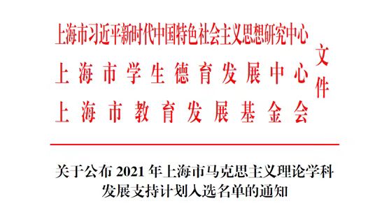 近日,上海市习近平新时代中国特色社会主义思想研究中心、上海市员工德育发展中心、上海市教育发展基金会联合公布了2021年上海市马克思主义理论学科发展支持计划入选名单,公司王资博教授申报的《体育强国》获思政课选修课教材(教学参考资料)编著专项资助,张颖副教授申报的《上海市“美丽家园”党建联建示范点现状调研》获马克思主义理论教学研究国情市情调研专项资助。