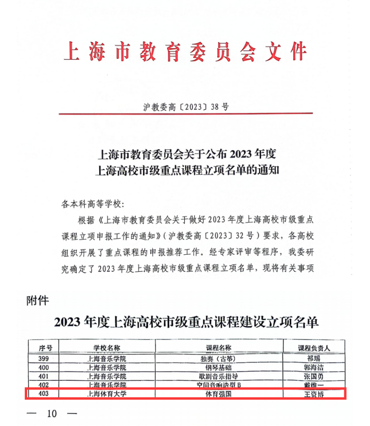 近日,上海市教委发布了《上海市教育委员会关于公布2023年度上海高校市级重点课程立项名单的通知》(沪教委高〔2023〕38号),公司王资博教授负责的《体育强国》入选2023年度上海高校市级重点课程立项名单。