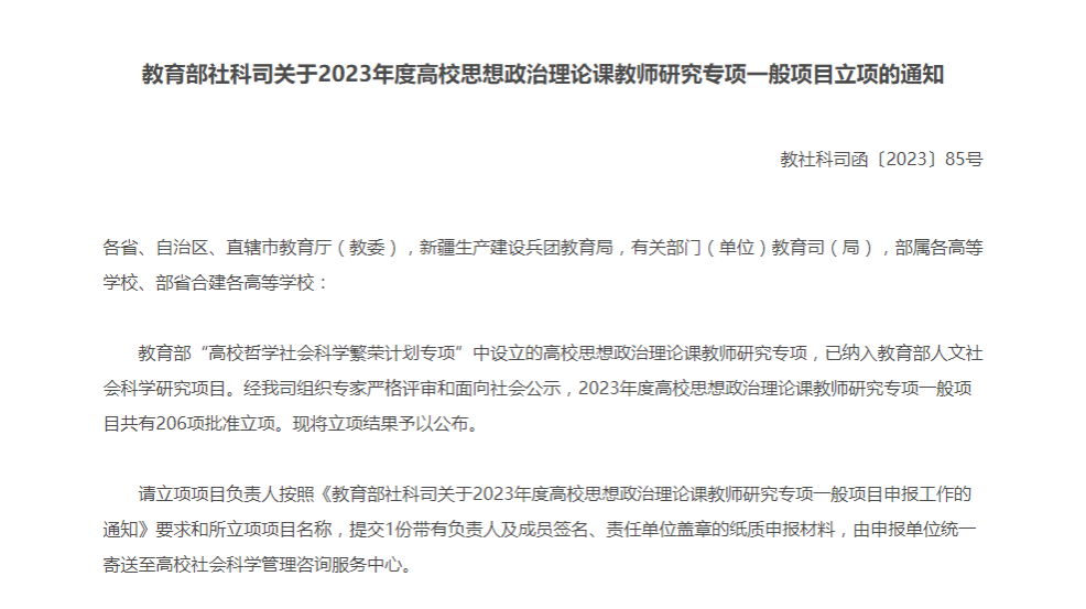 2023年度高校思想政治理论课教师研究专项一般项目包括教学研究项目、教学方法改革择优推广项目、优秀中青年思政课教师择优资助项目和教学研究青年项目四个类别,共计206个项目获得立项。
