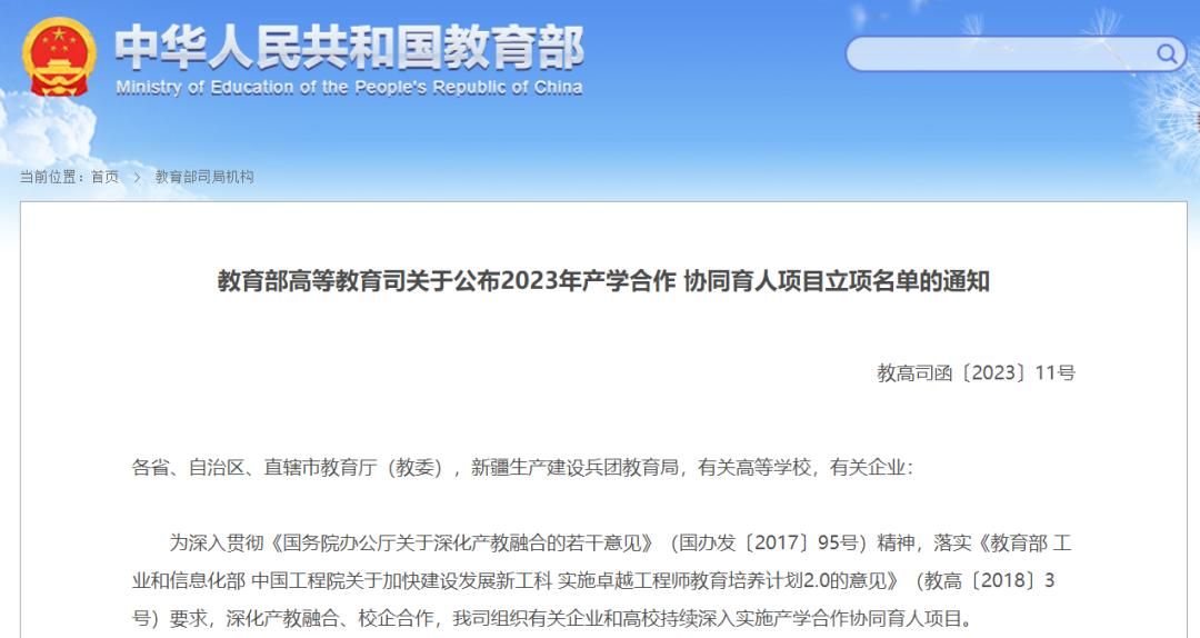 产学合作协同育人项目是教育部深入贯彻《国务院办公厅关于深化产教融合的若干意见》精神,落实《教育部工业和信息化部中国工程院关于加快建设发展新工科实施卓越工程师教育培养计划2.0的意见》要求,通过政府搭建平台、企业支持、高校对接、共建共享,实现高校人才培养与企业发展的合作共赢,是高校深化产教融合、增强人才自主培养能力的重要载体。