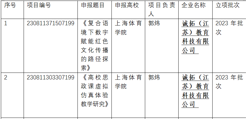 2023年12月11日,教育部发布《教育部高等教育司关于公布2023年产学合作协同育人项目立项名单的通知》(教高司函[2023]11号),公司郭炜副教授主持申报的《复合语境下数字赋能红色文化传播的路径探索》、《高校思政课虚拟仿真体验教学研究》均获立项。