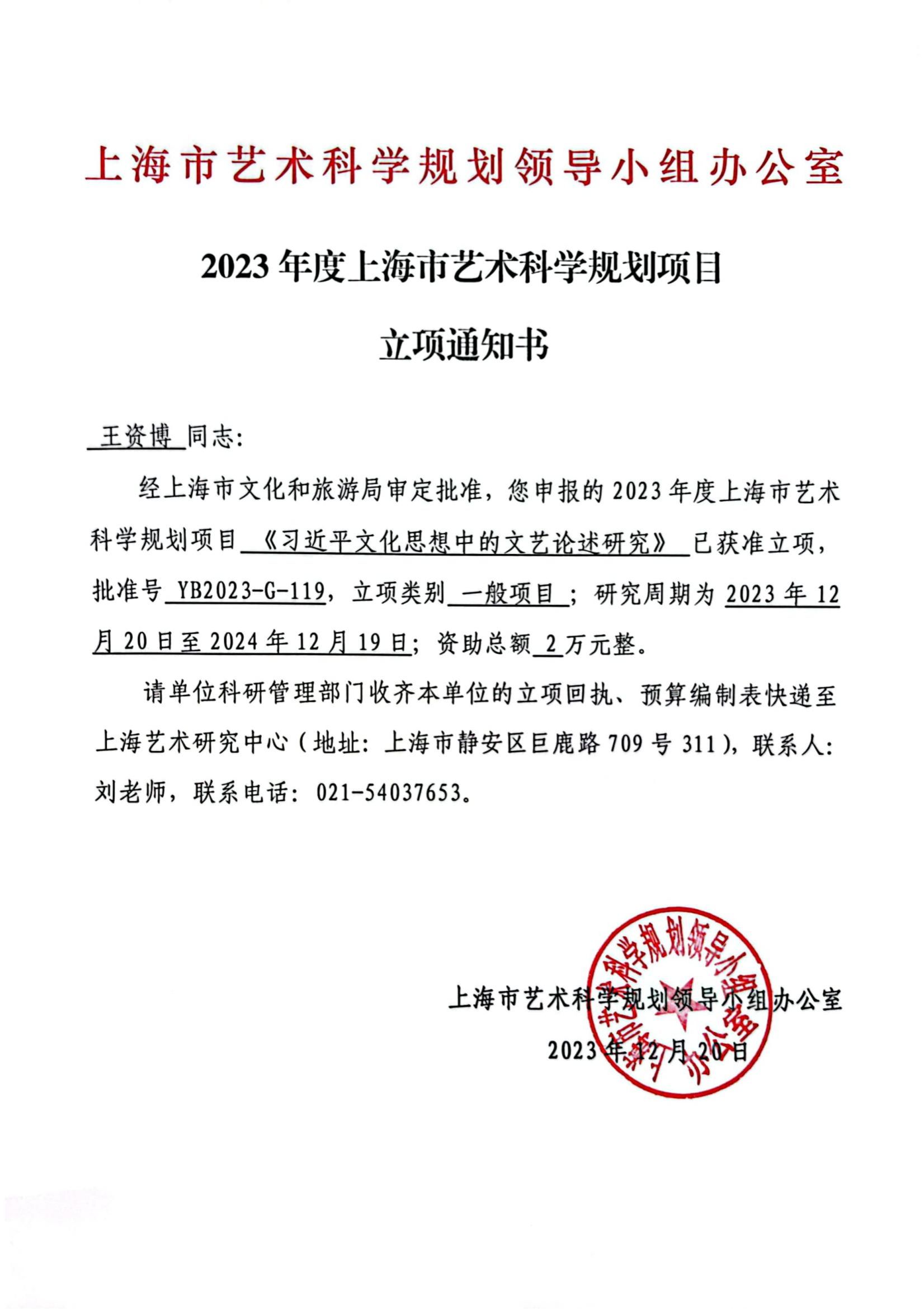 近日,经上海市文化和旅游局审定批准,上海市艺术科学规划领导小组办公室立项通知,公司王资博教授主持的《习近平文化思想中的文艺论述研究》立项为2023年度上海市艺术科学规划项目(批准号:YB2023-G-119),研究周期为2023年12月20日至2024年12月19日。这是公司yl6809永利在上海市艺术科学规划项目申报上的首次立项。