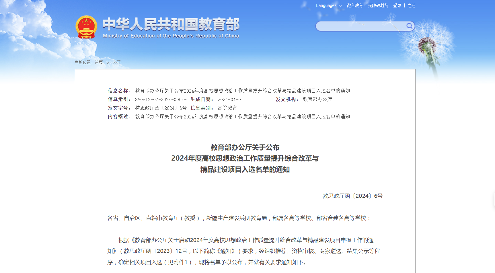 为深入贯彻落实习近平新时代中国特色社会主义思想和党的二十大精神,进一步加快构建落实立德树人根本任务新格局,推动各地各高校落实“时代新人铸魂工程”,着力培养担当民族复兴大任的时代新人,教育部于2023年9月启动2024年度高校思想政治工作质量提升综合改革与精品建设项目的申报工作,经组织推荐、资格审核、专家遴选、结果公示等程序,确定了相关入选项目。
